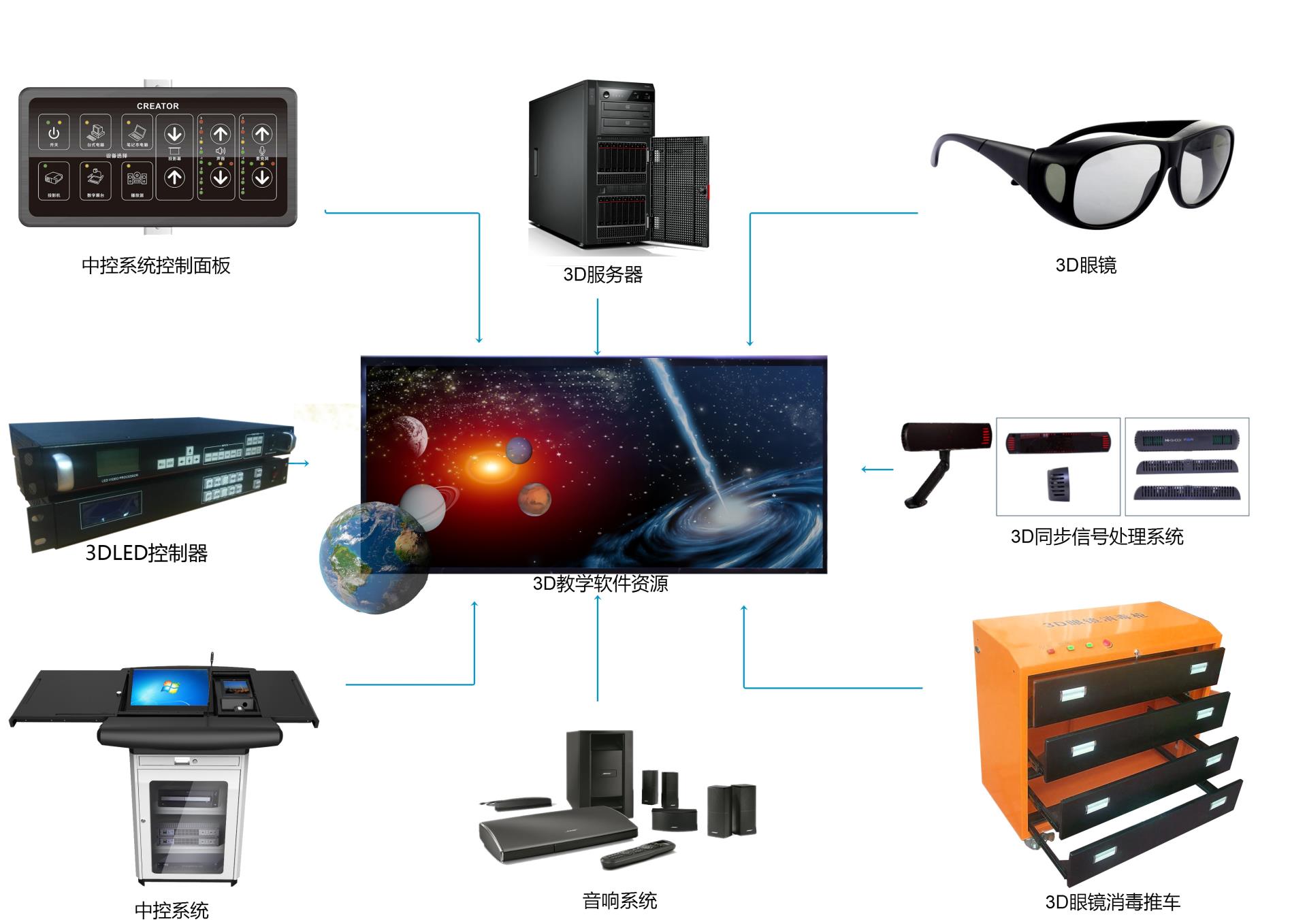 3D教学环境的搭建非常便利。需要做的只是布置一间3D教室、一套3D虚拟仿真演示平台、3D视频控制系统、一套3D服务器及3D信号处理系统、3D眼镜和3D互动教学软件(软件资源库)。即3D互动教学软件、3D互动智能平台(3D服务器,3D虚拟仿真显示平台,3D同步信号处理系统,音响系统与中控系统)、3D眼镜、3D消毒推车。